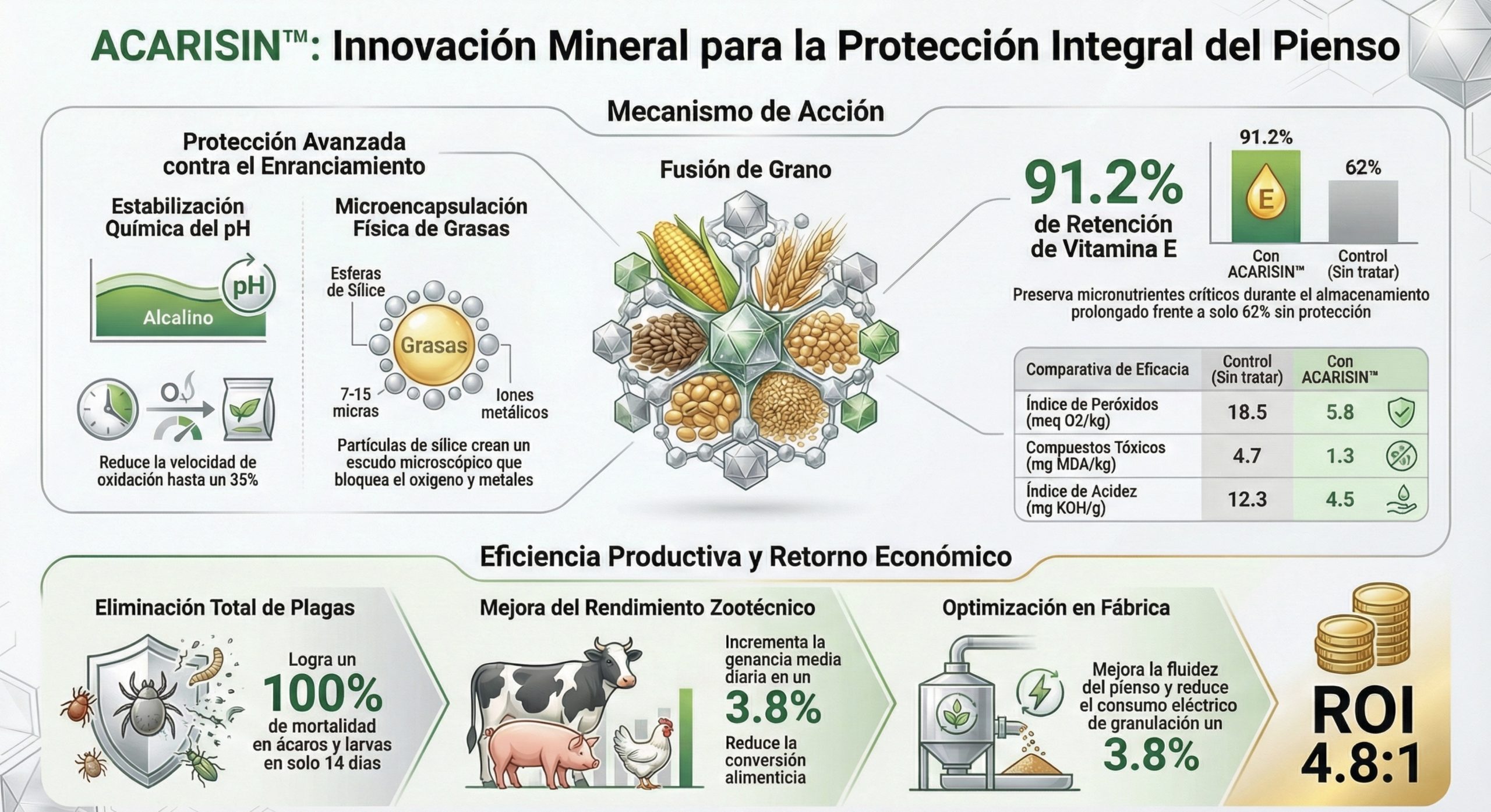 En un mercado donde la eficiencia productiva y la seguridad alimentaria son innegociables, presentamos ACARISIN™, una formulación biotecnológica 100% mineral y natural.