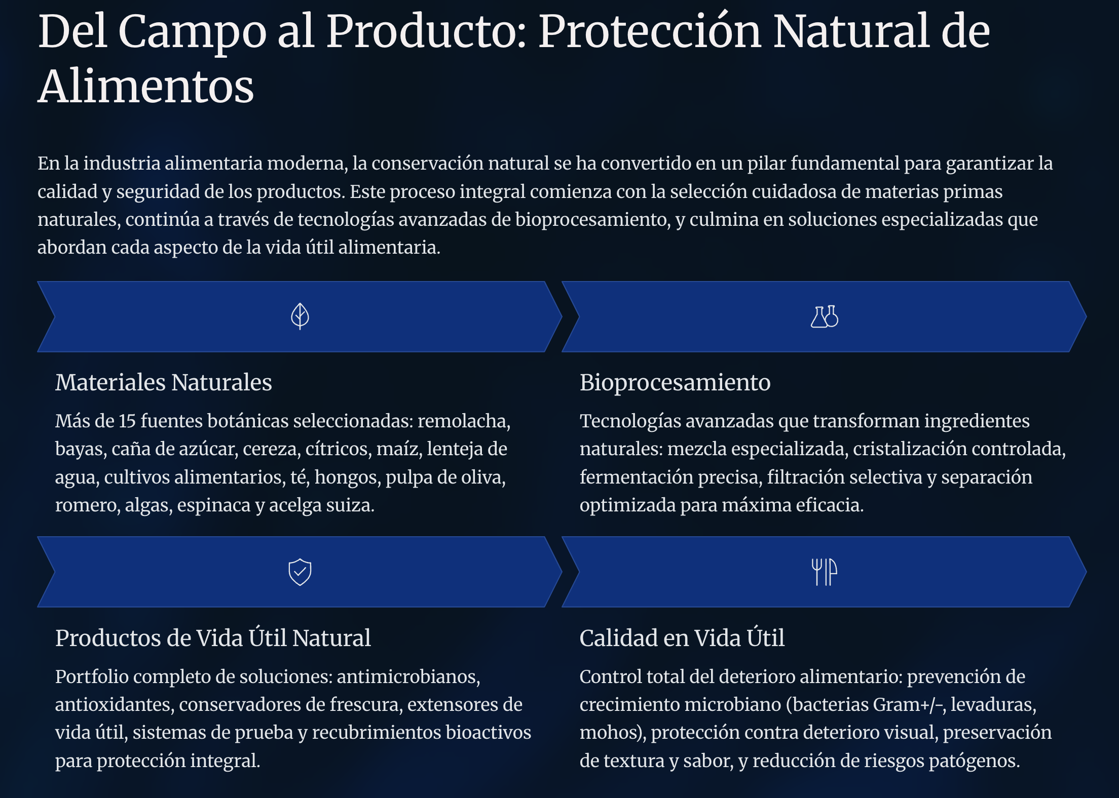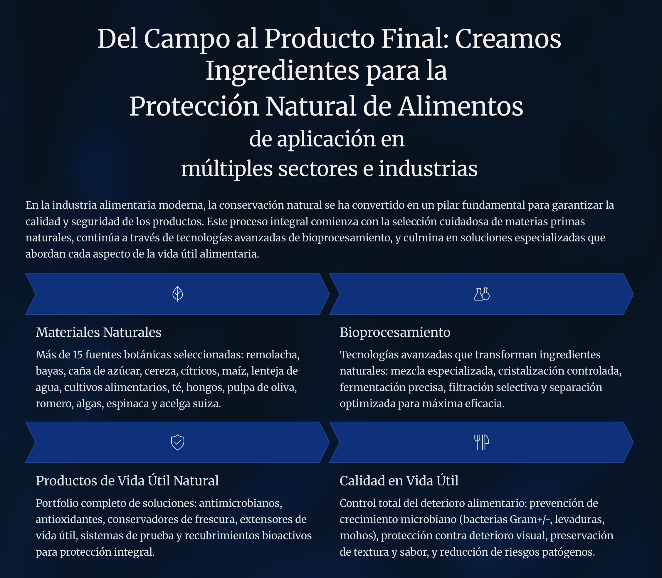 Nos hemos propuesto la compleja misión de establecer nuevos estándares en la industria, ayudando a las empresas a ofrecer productos más duraderos y de alta calidad conservados por medio de soluciones que la naturaleza pone a nuestro alcance.