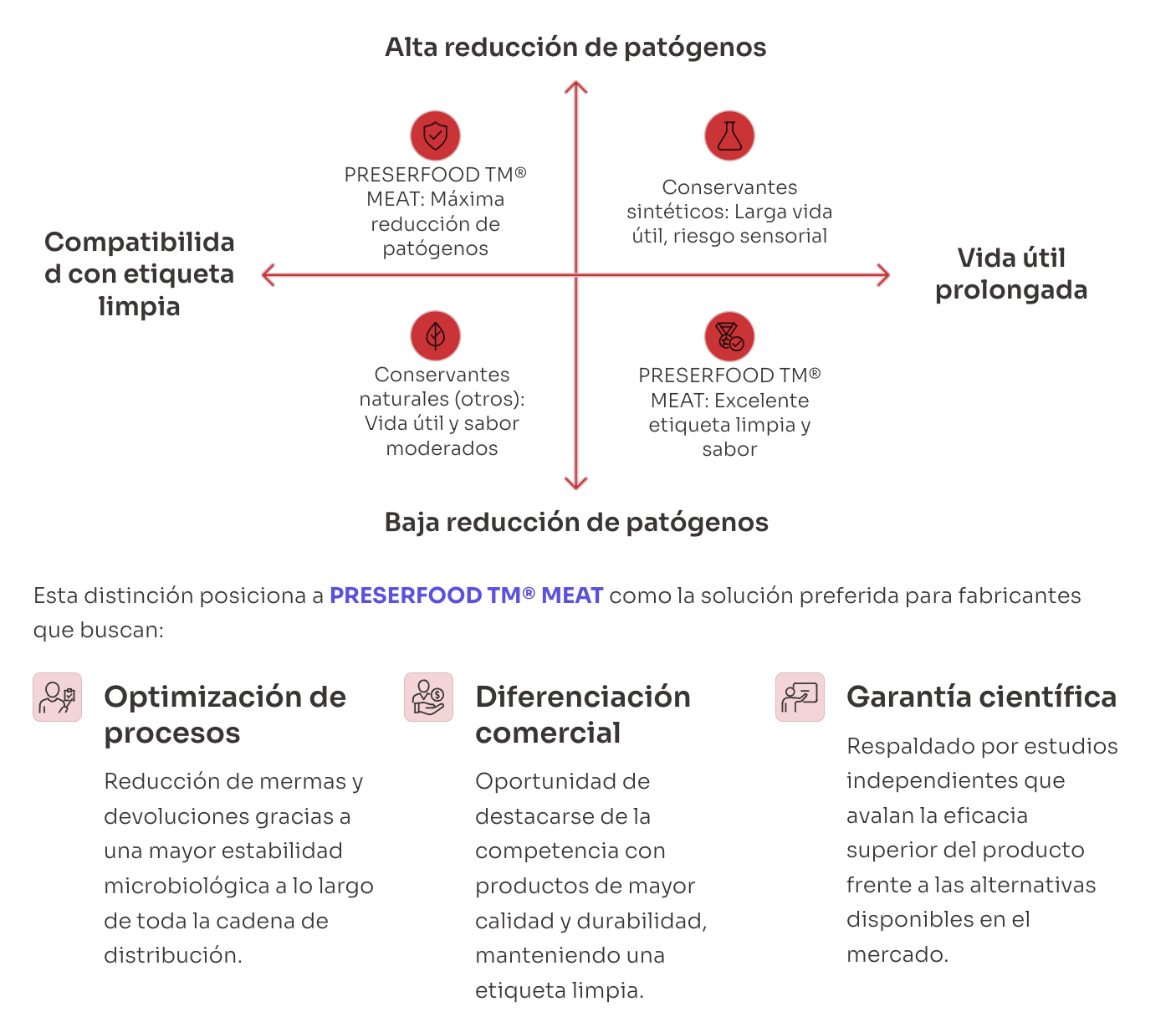 La efectividad de PRESERFOOD TM® MEAT no solo se traduce en productos más seguros, sino también en productos cárnicos que destacan en el mercado por su calidad superior, textura mejorada, sabor excepcional y durabilidad inigualable en comparación con otros conservantes naturales o químico-sintéticos disponibles actualmente.