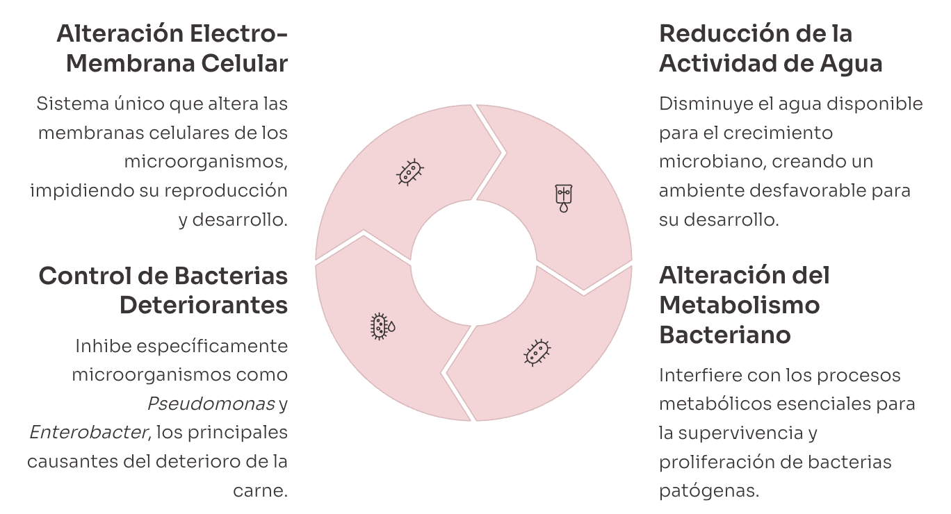 La eficacia de nuestro sistema de «Disrupción Electro-celular de la Membrana» representa una innovación significativa en el campo de la conservación de alimentos. Este mecanismo actúa directamente sobre la estructura celular de los microorganismos, creando alteraciones en sus membranas que impiden su funcionamiento normal y su reproducción. A diferencia de otros conservantes que simplemente retrasan el crecimiento bacteriano, PRESERFOOD TM® MEAT interviene en procesos fundamentales para la viabilidad microbiana, proporcionando una protección más duradera y eficaz.