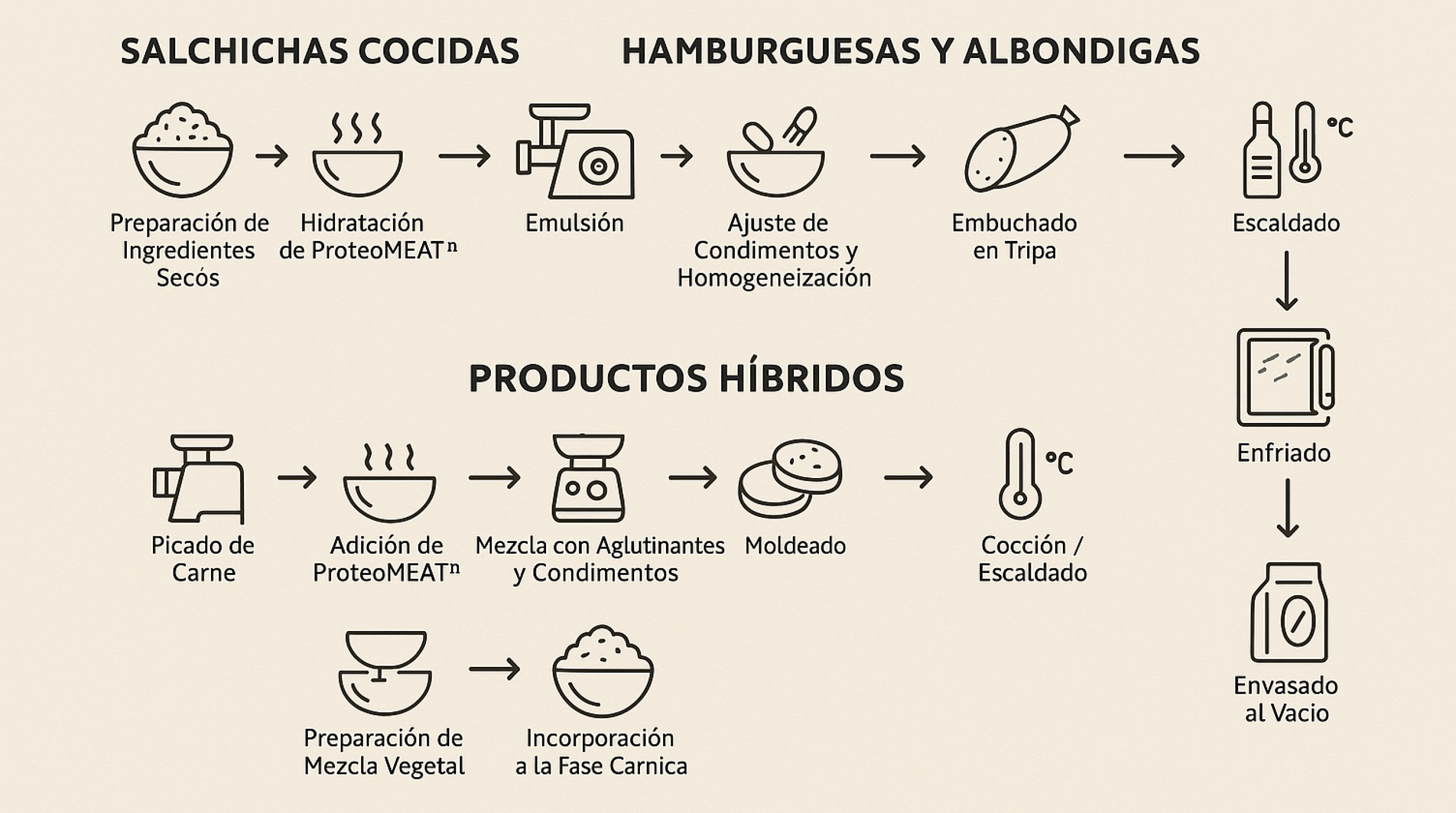 Hidratación de ProteoMeat™: relación 1:2 (producto:agua), 30 min a 60–70 °C.